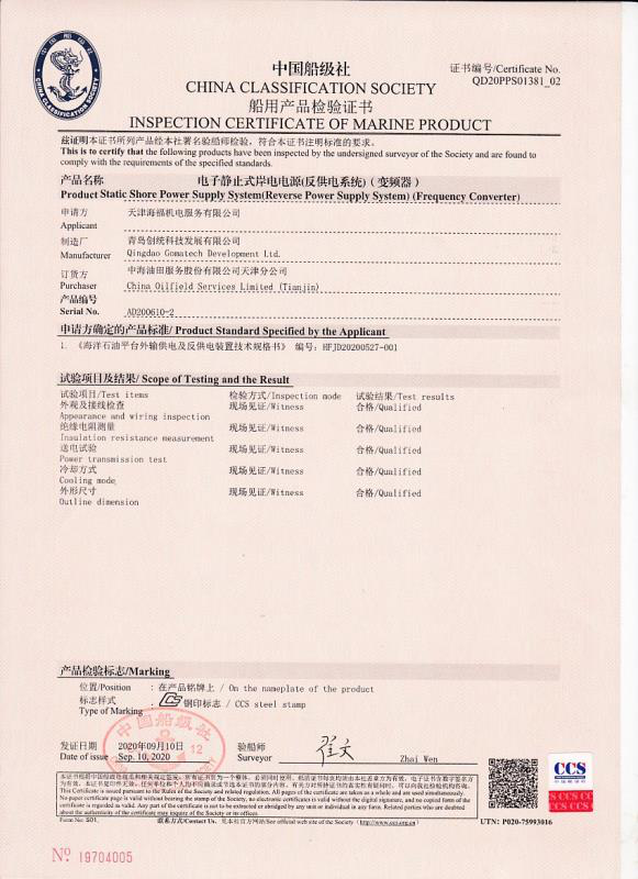 岸電設(shè)備通過了中國(guó)船級(jí)社認(rèn)證并獲得認(rèn)證證書,獲得國(guó)家電力電子產(chǎn)品質(zhì)量監(jiān)督檢驗(yàn)中心檢測(cè)證書。